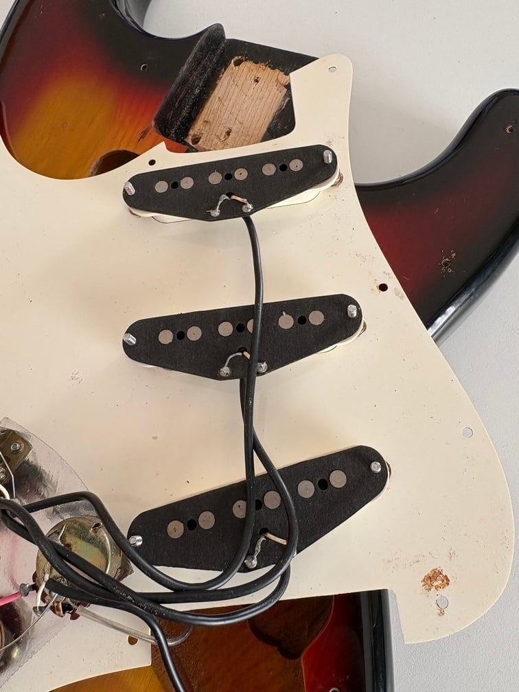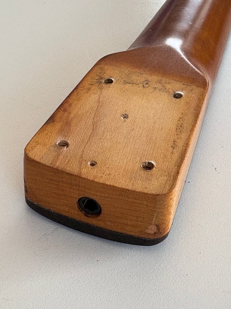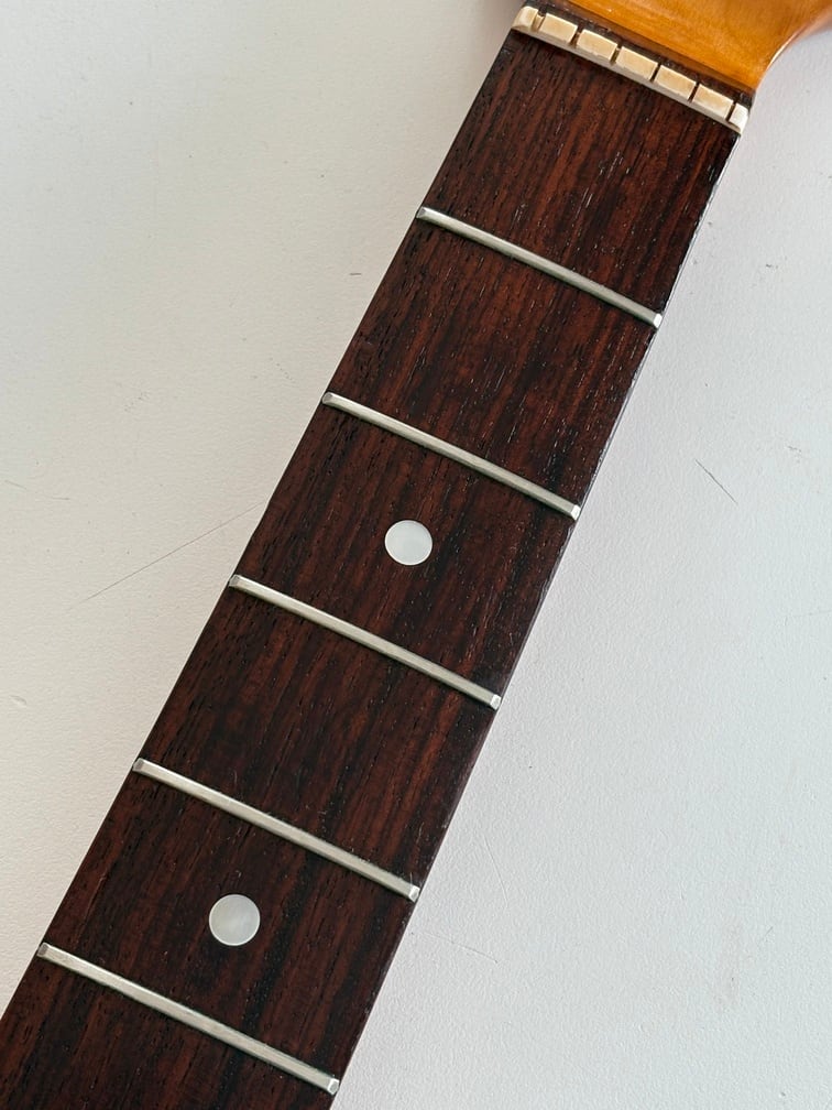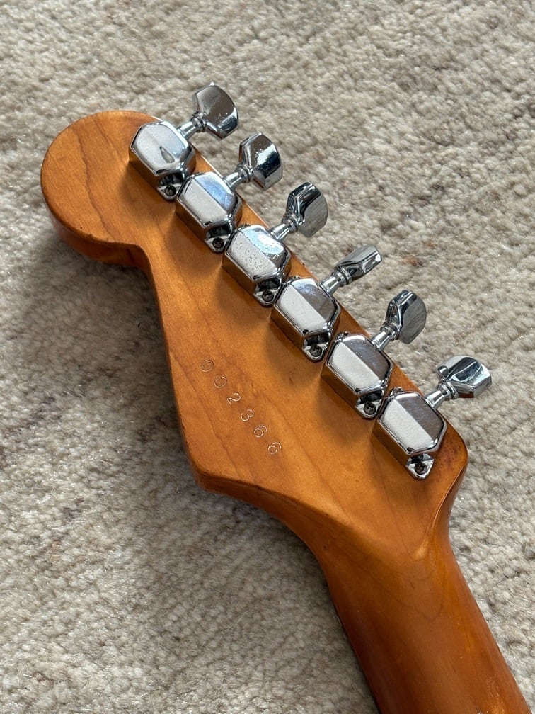 細かな打痕や色あせなど経年変化が見られますが、ナチュラルエイジング感が渋いギターです